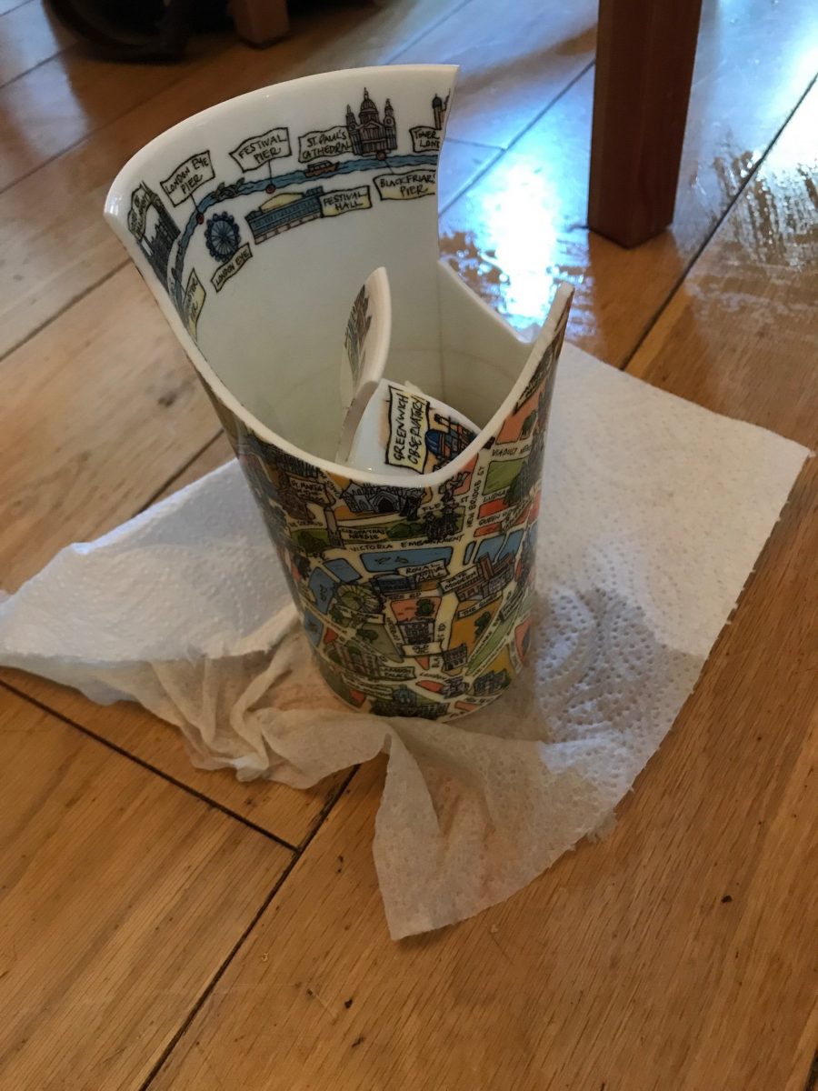 Flash forward to today. M texted me this photo of the broken mug. She wasn’t sure what she did but the mug fell off the table and is now destroyed.