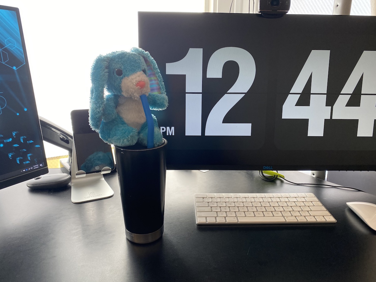 With us all being home now due to the lockdown the other day A asked when I was going to do lunch with Bun-Bun. Today in the morning she showed up in my home office and brought Bun-Bun to me saying she wanted to hang out. I had to utilise the opportunity to get a picture of. I am barn having a cold brew with me.