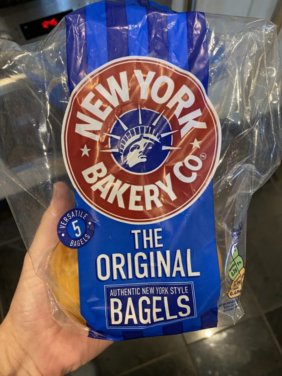When the new lockdown happened in early November we weren’t sure if gymnastics would be cancelled. It turns out in person gymnastics was cancelled. They did offer zoom classes around the same time in person class would have been. For the first session we moved our coffee table out of the living room and the girls had a decent amount of carpeted space to do their workout. Since we were not out and about to go to the bakery I thought to go to Sainsbury’s for a few things. They had the bagels pictured so I decided to pick up a bag. Just looking at the bag it is apparent they are not New York bagels regardless of what the label says. M correctly points out these bagels look more like the frozen lenders bagels from our childhood. Nevertheless I got a bag and took them home with some cream cheese or as they call it in the UK “soft.cheese”. The girls were super happy for the surprise.
