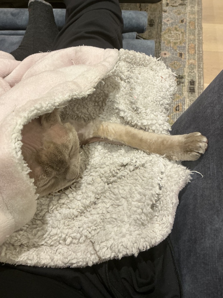 We get him and cuddle and snuggle up with him and wrap him in a blanket pretty snugly, and then one of us will put the medicine on his head, and then he finally realizes it as we’re finishing and slithers out of the blanket and runs away. The damage is already done, though, and he’s got his flea treatment.
