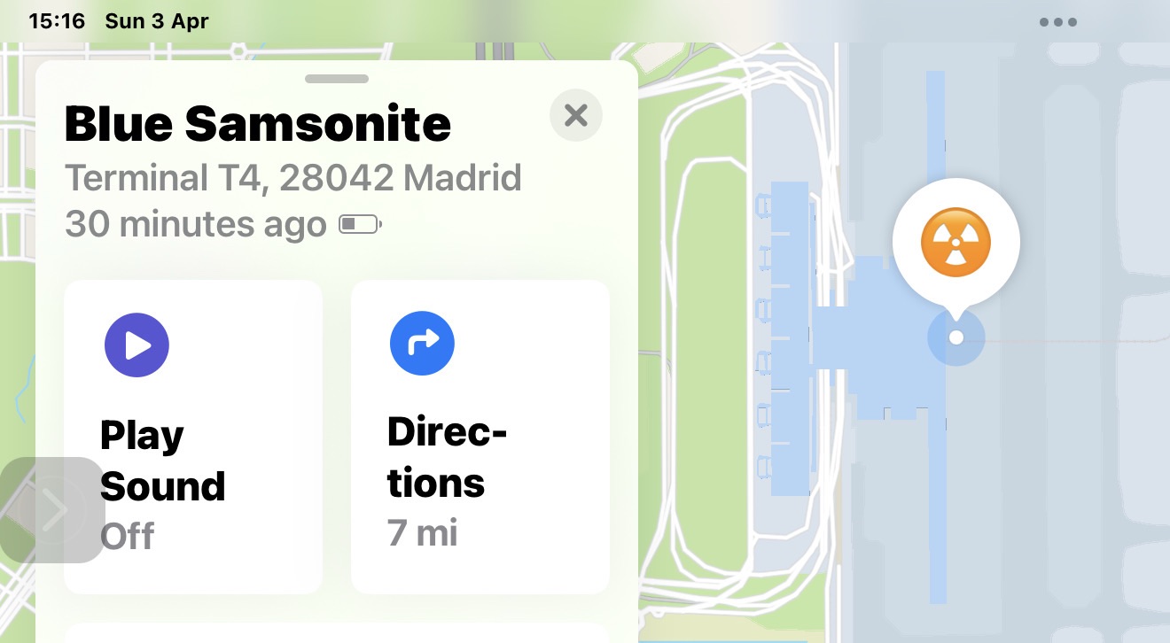 In 2021, we flew to Madrid on British Airways and I had AirTags on all four pieces of luggage. The flight was delayed leaving Heathrow due to BA issues, and when we finally landed and were waiting at the carousel, I opened Find My to check. Three of the bags showed as nearby, but the fourth was still pinging from Heathrow. Immediate red flag. Sure enough, someone from baggage claim walked around with a list of names, and my bag was on it. The one with all my stuff, of course.