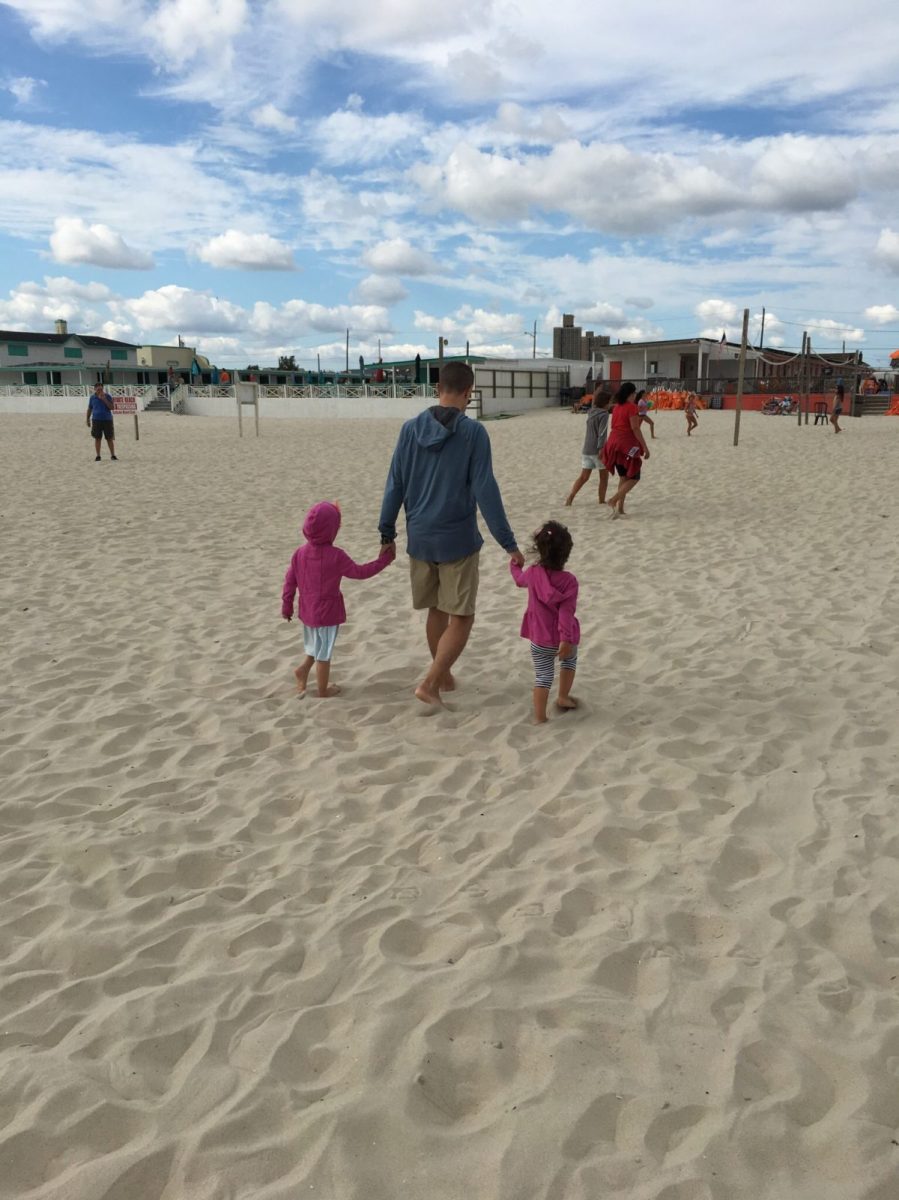 The last day at the beach for the summer was a bit anticlimactic. We originally thought we would have Monday of Labor Day at the beach however due to the tropical storm the weather wasn’t looking good. Even on the Saturday morning of Labor Day weekend it was not looking like the greatest beach day however we wanted to get one last day in. I went with my mom and the girls to the beach since MC was not feeling well. In the morning it was pretty empty. By the afternoon some people it should however we didn’t use the key poles or go to the regular pool since it was too cold. I didn’t stop the girls from enjoying the sand and running around. I think they had a blast in the morning since the court was empty and they got to run all over without having to worry about getting in the way of anyone.