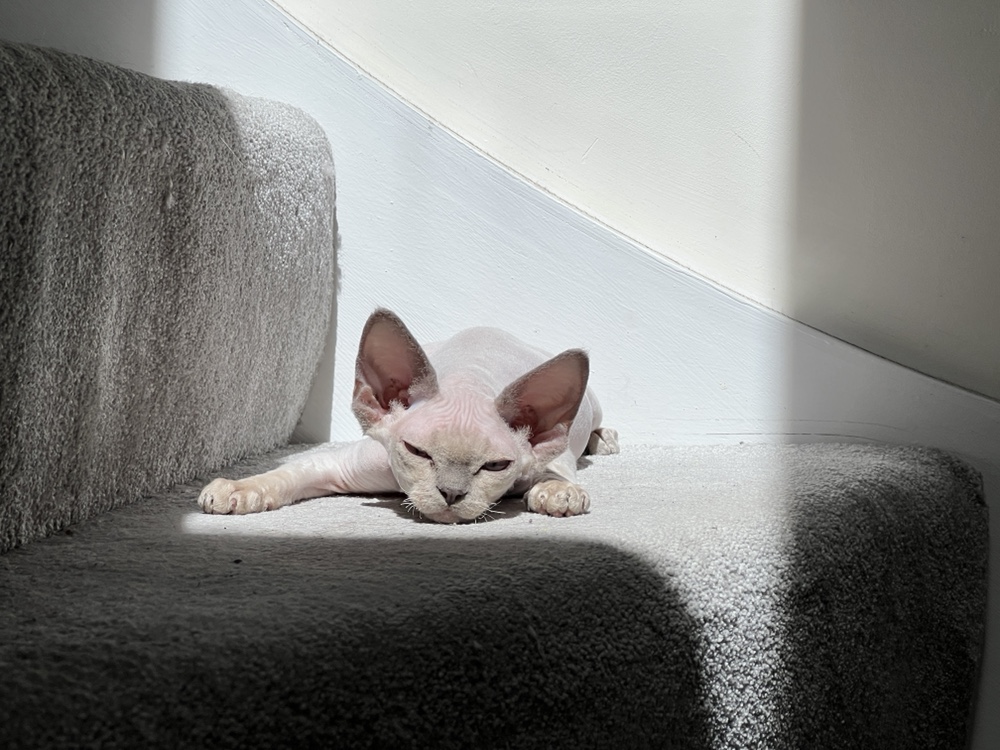 Today I was walking down my stairs as I normally do to get coffee in the middle of the day. My cat Grogu thinks it’s a game and when I put my hand on the top of the banister he tries to paw at it. I went to lean down and pet him when he was doing that. He had other ideas. At the same moment I was leaning down he was making a full leap with the intention of jumping up to my shoulder. Since I was going down and he was going up I mostly missed him. His paws scratched my neck a bit. However he kept going since my shoulder wasn’t where he thought it was going to be. When I mean he kept going, his trajectory took him two thirds of the way down my stairs. I cannot say for certain if he landed legs up however he recovered pretty quickly. For about three or four seconds I thought he was going to fly all the way to the bottom of the stairs and hit our step cabinet. While I was still getting over the shock of the situation he was sitting on the bottom step licking his paw waiting for me to finish walking downstairs.