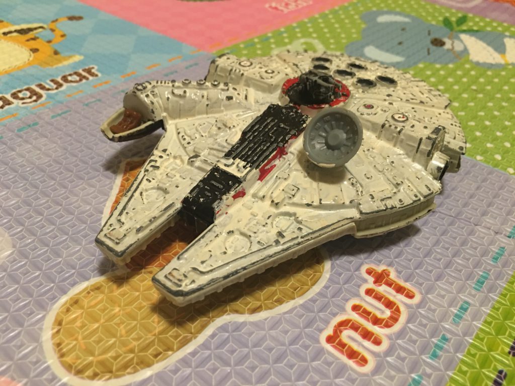 Saturday I got a box of old toys from my mom that she had been storing for me.  Now that she gave me my lego’s earlier in the week she wanted to clean house and give me the rest of the toys she had of mine.  I was happy to take them.  Last night I started introducing some of them to the girls. There were some new matchbox cars as well as some small matchbox car sized fighter jets. Among the stuff was also my old metal star destroyer and the millennium falcon. I explained that the millennium falcon is the ship that Chewbacca flies in.  The girls are both into Chewbacca so that got some interest.